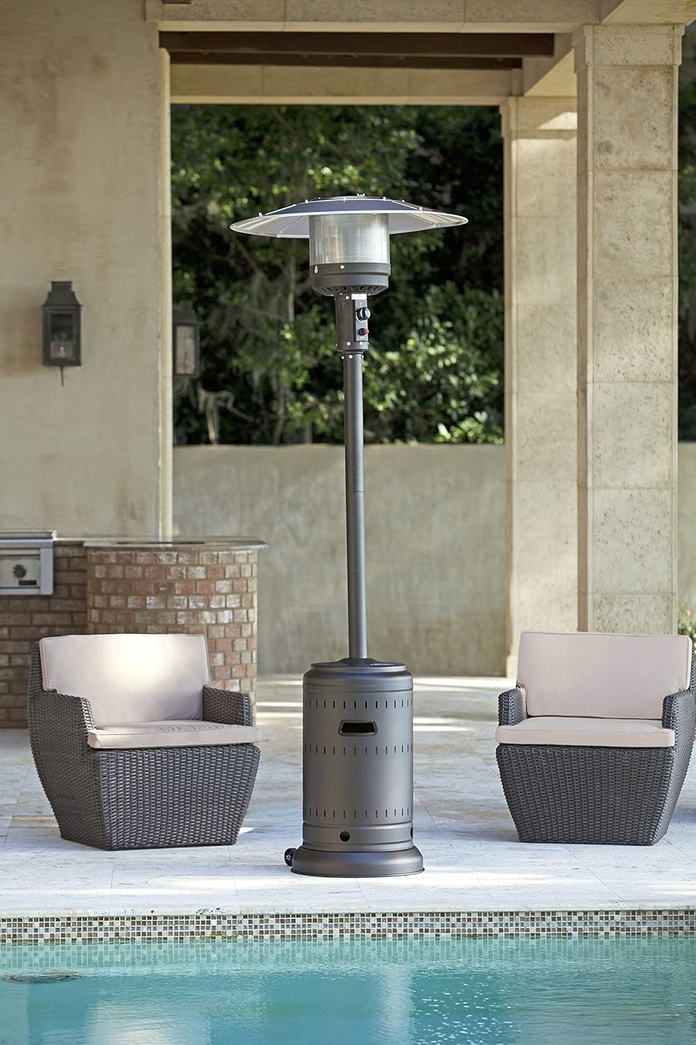 Enjoy your patio in all seasons with this Gray Commercial Patio Heater with Wheels by Fire Sense. This outdoor propane patio heater spreads the heat all around you so that you can easily enjoy being outdoors even during chilly weather. It will effortlessly keep you and your loved ones warm and toasty so that you do not have to stay indoors. The attractive Gray color finish perfectly accents and enhances your patio decor. The propane heater features a Piezo ignition system that will turn on the heater in an instant so that you do not have to wait around for the air around you to be heated. Also, this way you only use the fuel you need. This gas patio heater uses a 20 pound LP gas cylinder which is not included with your purchase and produces a heat output of 46,000 BTU. This propane tank will last you approximately 10 hours. The heavy duty convenient wheels allow you to easily navigate and position this propane patio heater in the perfect spot for your outdoor entertainment. This outdoor propane heater for patio also comes with a weighted base and a tip over protection system so you do not have to worry about the propane patio heater accidentally falling over. It also comes with a safety auto shut off tilt valve for additional safety. This Fire Sense patio heater is the perfect solution for any outdoor gatherings you want to have during the winters.